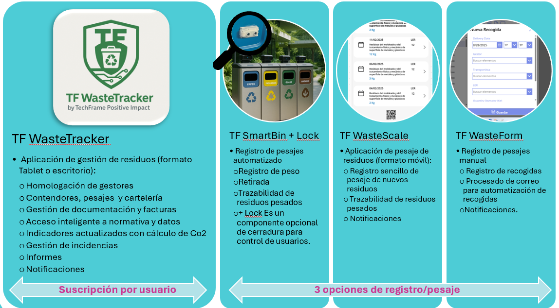 TF WasteTracker es una herramienta tecnológica diseñada para facilitar una gestión de residuos eficiente, trazable y alineada con los principios de economía circular. Esta solución se adapta a diferentes entornos (empresas, instalaciones, instituciones públicas) y combina funcionalidades avanzadas con una interfaz accesible desde tablet o escritorio.